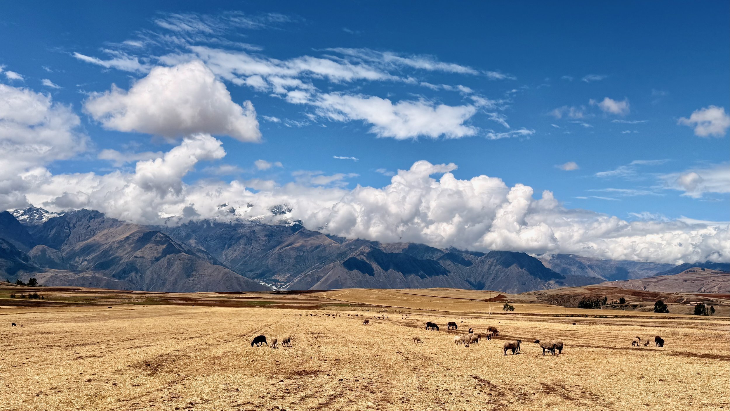 Open plains with grazing animals, mountain range in the background, and a blue sky with clouds.