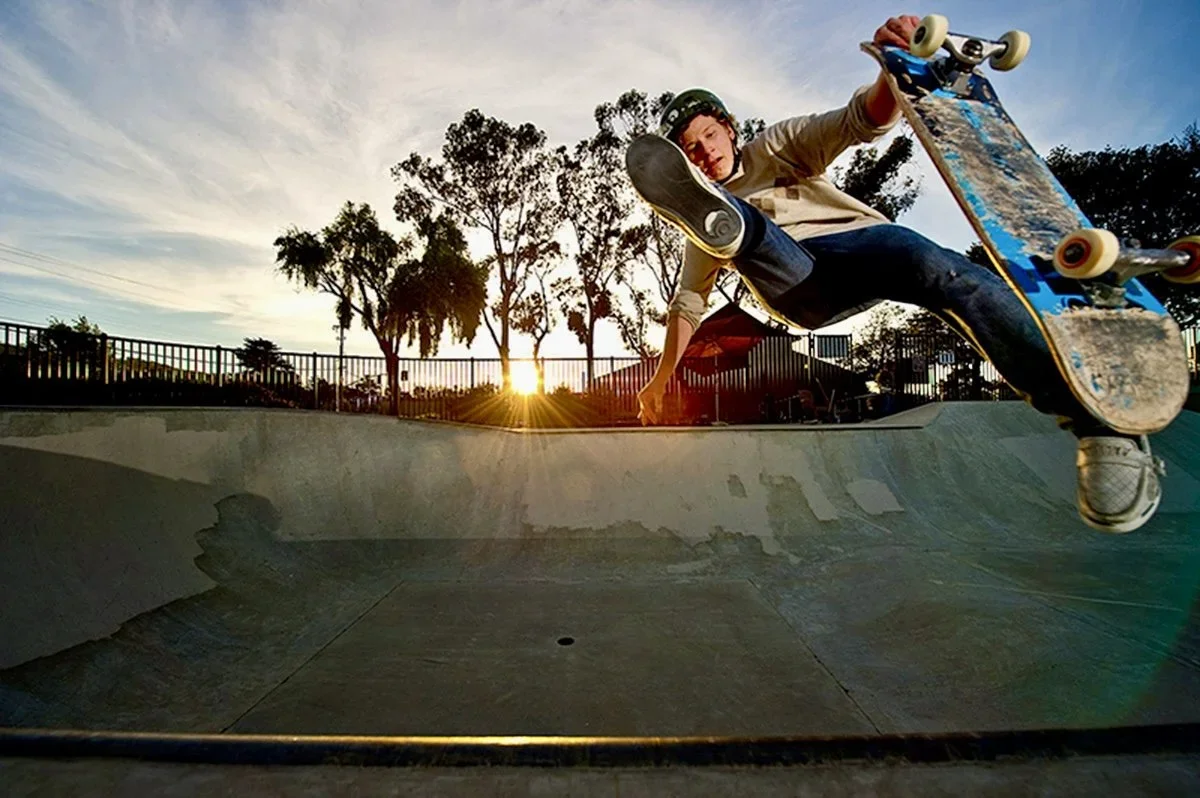 A young skateboarder performing an aerial trick at a skate park during sunset.